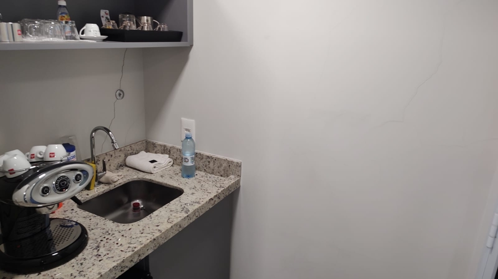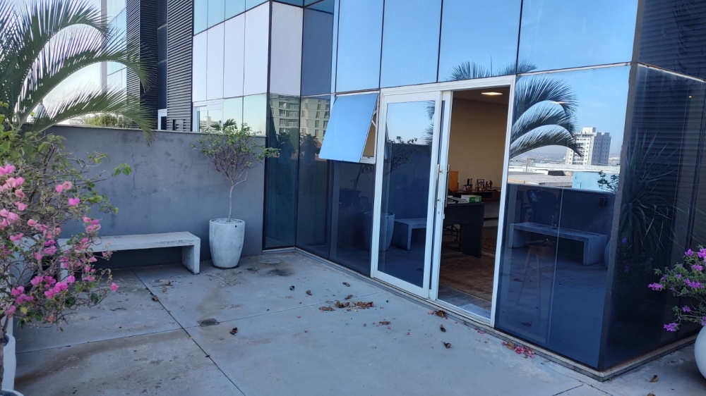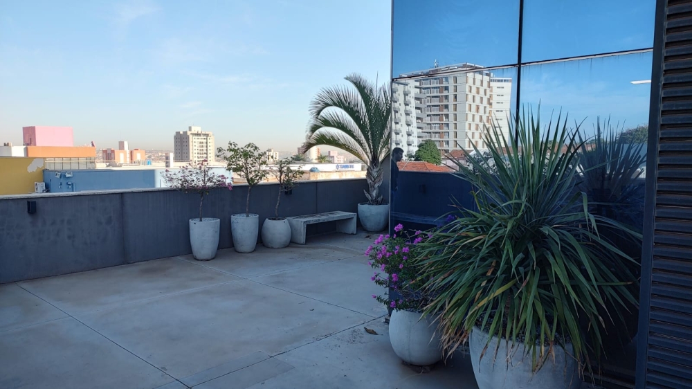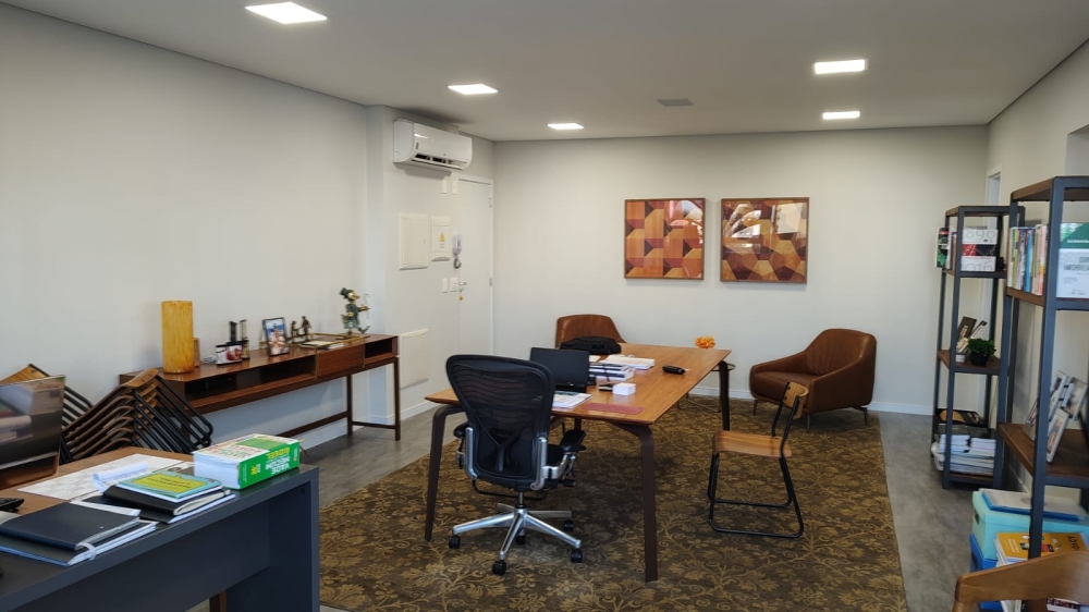 Excelente Sala Comercial, mobiliada com mesa de reunião grande, mesa diretor, aparador, estantes, Wc, Copa, ampla sacada com jardinagem.